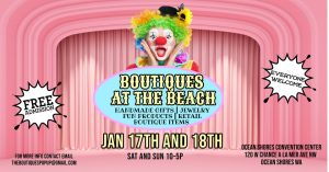 Boutiques at the Beach is a fun faily friendly circus themed market featuring all kinds of vendors handmade and retail with a fun pastel circus theme. Come in costume, or just come and clown around!